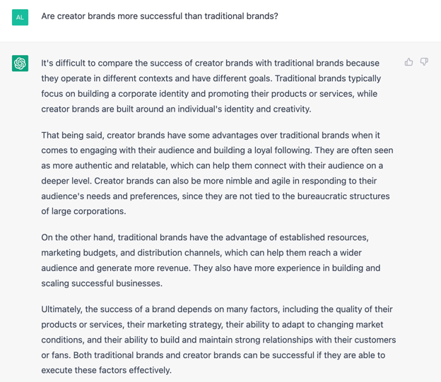 Ultimately, the success of a brand depends on many factors, including the quality of their products or services, their marketing strategy, their ability to adapt to changing market conditions, and their ability to build and maintain strong relationships with their customers or fans. Both traditional brands and creator brands can be successful if they are able to execute these factors effectively.